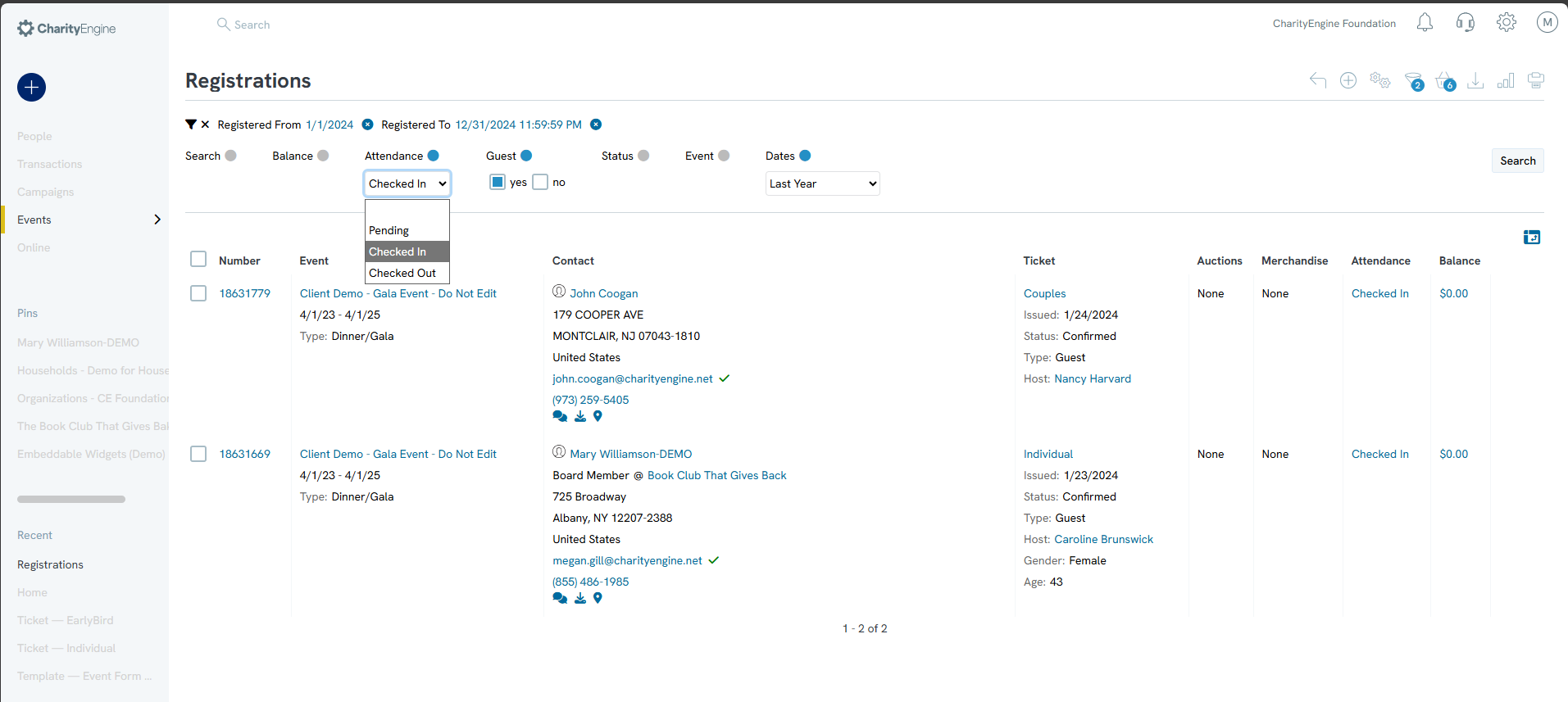 NOTE: If the basic filters are changed to exclude already checked-in registrants, the registrant will disappear from the listing after check-in.