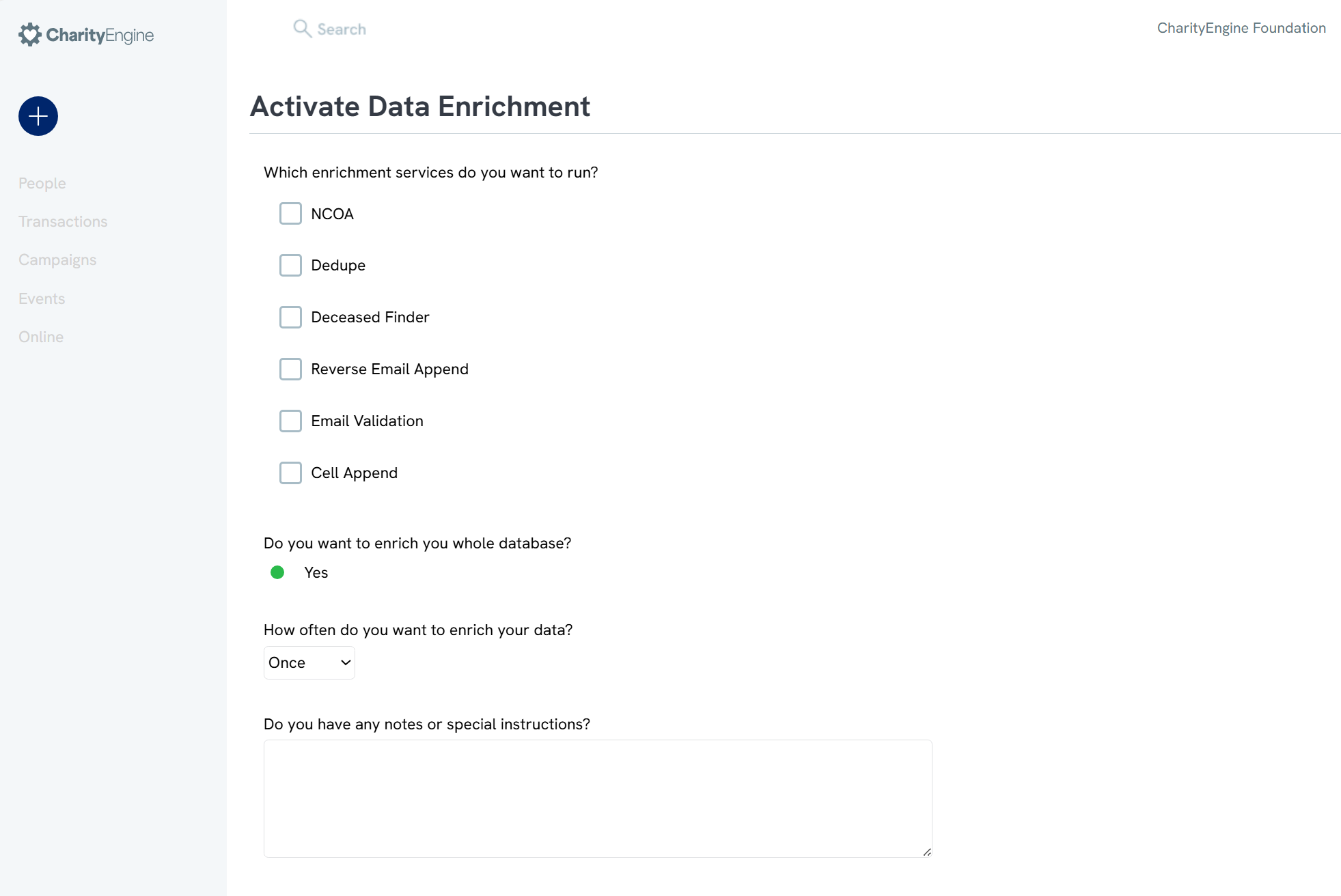 Note: If any selected enrichment services are not included in your current plan, CharityEngine will provide a pricing estimate for review and approval before executing the request.