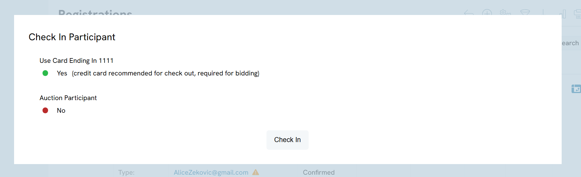 Step 13: A pop-up will appear asking you to confirm the attendee check-in. Click CHECK IN to proceed. At this stage, you can also collect the registrant’s credit card information if they plan to participate in an event auction or other paid activities later.