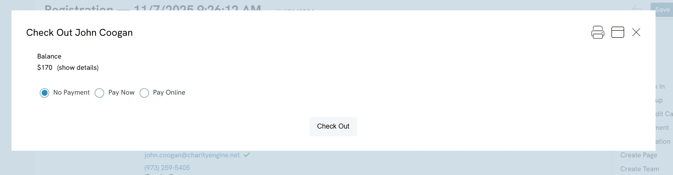 - If the attendee is ready to pay, select Pay Now and click Check Out.